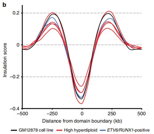 在此,作者對匹配基因組圖數據集(WGS/WES/芯片)的樣本進行蛋白組質譜檢測、RNA測序,并通過Hi-C對超二倍體和ETV6/ runx1陽性的兒童原發(fā)性患者樣本進行三維構象研究。作者發(fā)現(xiàn)作為染色質結構的主要調控因子的CTCF和黏連蛋白,在超二倍體中均表現(xiàn)出低表達。與此同時,在超二倍體個體中發(fā)現(xiàn)了與拓撲關聯(lián)域(TAD)邊界相關的基因表現(xiàn)為普遍的表達失調。此外,超二倍體兒童ALL患者的Hi-C表明,2/4病例的TAD邊界強度明顯丟失,3/4病例的TAD邊界絕緣程度降低。