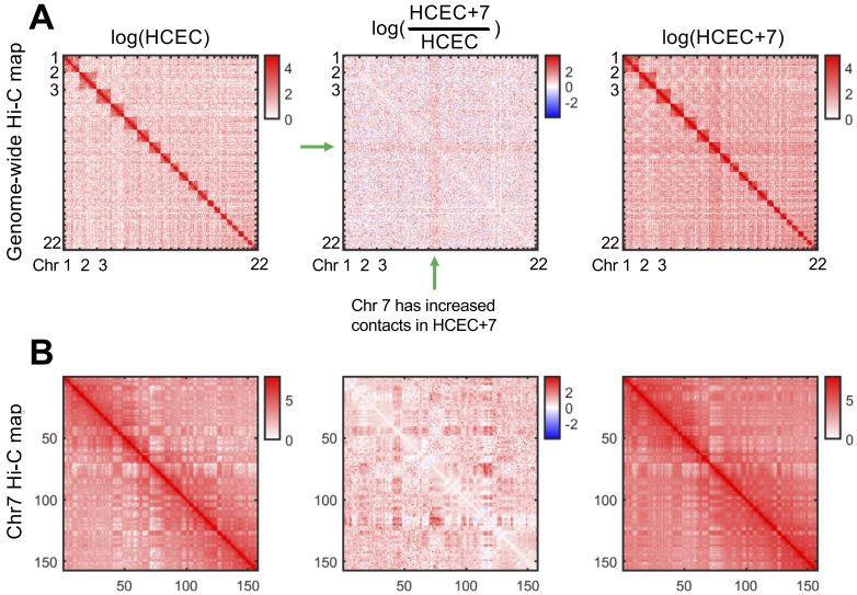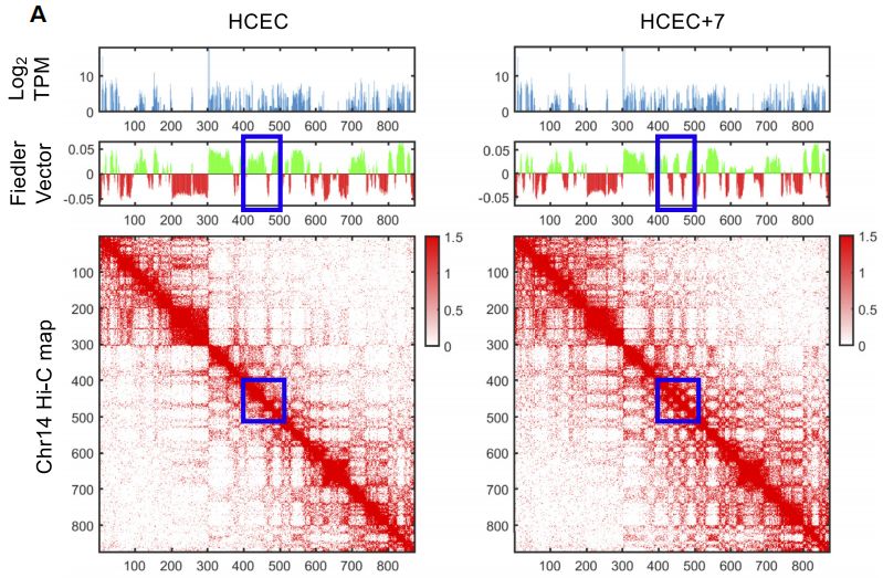作者研究了一個正常核型的健康結腸粘膜構建的細胞系及其同源的衍生細胞系,該衍生細胞系唯一異常是有一個額外的7號染色體拷貝(47,XY,+7)。作者使用Hi-C、RNA測序和蛋白質組分析研究了非整倍化后結構、功能的變化及其關系。7號染色體的增加導致了該染色體基因轉錄水平的增加,以及全基因組基因和蛋白表達的變化。Hi-C分析表明,7號染色體的額外拷貝反映在三倍體染色體間有更多的染色體間互作,且全基因組范圍內出現(xiàn)了染色質組織的變化,包括A/B區(qū)域化和拓撲關聯(lián)域(TAD)邊界的變化。最值得注意的是,4號染色體顯示出染色質組織的嚴重缺失,而14號染色體包含一個大的A/B?compartment轉換區(qū)域,同時其中的基因表達發(fā)生改變。間期FISH檢測染色體涂染探針距離發(fā)現(xiàn)額外的7號染色體區(qū)域的核位置未發(fā)生變化。此外衍生細胞系中基因和蛋白富集在惡性轉化的關鍵信號通路,如HGF/MET-axis??傊?,一個特異的染色體非整倍體對核結構和功能有重大影響,無論是局域的還是全基因組的,此研究為分析具有復雜核型的癌癥核組織提供了一個基礎。