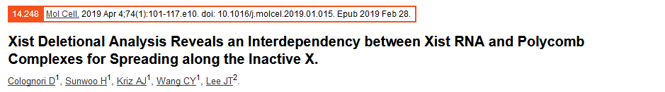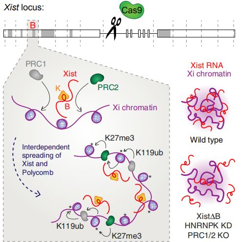 在X染色體失活期間,Xist RNA傳播包覆整個染色體,以建立沉默,但是參與傳播的功能RNA元件及機制仍未確定。作者通過一個全面的內源性Xist缺失研究,發(fā)現(xiàn)Repeat B 對于在Xist的傳播和多梳狀復合物1和2 (PRC1/PRC2)的作用至關重要,會影響染色體的三維結構。刪除Repeat B或其直接結合伴侶HNRNPK會影響PRC1和PRC2的招募。反過來,去除PRC1或PRC2又會削弱Xist的傳播。因此,Xist和多梳狀復合物傳播包覆整個染色體時具有彼此依賴性,這三個因子對于X染色體失活至關重要,且三者是密不可分的。