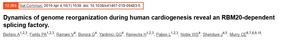 人類發(fā)育過程中空間基因組組織的功能變化尚不清楚。作者通過Hi-C、RNA-seq和ATAC-seq多組學技術聯(lián)合研究,揭示了人類心臟從多功能干細胞的核動力學的全面圖譜。雖然染色質可及性和基因表達呈現(xiàn)復雜的開/關動態(tài)變化,但大規(guī)模的基因組結構變化大多是單向的。許多大的心臟基因在分化過程中從抑制性向活躍性compartment轉換,同時表達發(fā)生上調。作者在此確定了這樣一個染色體間互作增加,并且是肌肉特異性剪接因子RBM20靶點的基因位點網絡。此外,心臟中主要的RBM20調控轉錄本TTN?pre-mRNA可以驅動TTN位點與其它染色體間的RBM20靶點(如CACNA1C和CAMK2D)之間的空間鄰近性。這一機制促進了RBM20依賴的轉錄產物的選擇性剪接,表明心臟特異性反式互作的染色質結構域(TID)是作為“剪接工廠”的功能性存在。
