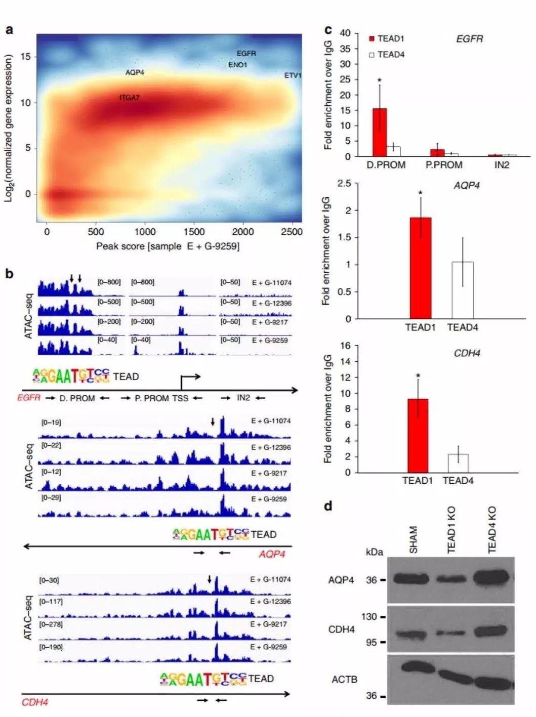 GSC中TEAD1可接近區(qū)域peak(ATAC-seq)和基因表達(dá)水平(RNA-seq)的一致性分析,結(jié)合GBM中TEAD1與基因共表達(dá)(TCGA中的GBM RNA-seq數(shù)據(jù))分析,發(fā)現(xiàn)TEAD1的靶基因包括EGFR、AQP4、CDH4、TNC等多個(gè)候選靶基因。