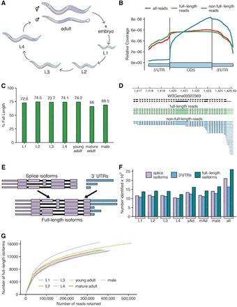 目前絕大多數(shù)的轉錄組注釋都是依賴于cDNA高通量測序固有的短讀長測序技術。線蟲的基因組緊湊,注釋良好,細胞譜系穩(wěn)定,是一種理想的實驗模型生物。然而,在秀麗桿線蟲的轉錄組中,大約有超過一半的轉錄本缺少全長信息的支撐,且依賴于無法跨越轉錄本全長序列的短reads的預測。同時,利用短讀長對polyA和3’UTR進行預測,并不能直接鑒定到剪接轉錄本的起始位點,且在3’UTR鑒定中,依賴于將推測的剪接位點分配給最近的重疊或上游基因。相比之下,納米孔測序沒有理論上的讀取長度上限,能夠在單個分子水平上對轉錄本進行一端到另一端的測序。