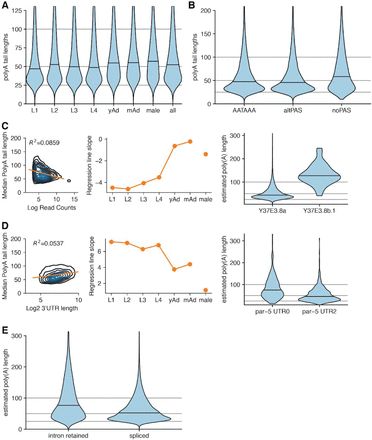 PolyA的長度,有可能和3’?UTR區(qū)域的polyA剪接位點(AAUAAA)有關。為了證明該推測,本文對不同polyA剪接位點類型(經(jīng)典的、可變的及無剪接位點)的polyA尾進行了長度統(tǒng)計,發(fā)現(xiàn)不同類型間存在顯著差異,且3’UTR區(qū)域不存在polyA剪接位點的,具有更長的polyA尾巴。在3’UTR區(qū)域,無polyA剪接位點的,其polyA長度中位數(shù)為58 nt,具有可變polyA剪接位點的,長度為46 nt;具有經(jīng)典的polyA剪接位點(AAUAAA),其長度中位數(shù)為48 nt。研究表明,polyA尾的長度與基因表達呈現(xiàn)負相關,即高表達的基因具有更短的polyA尾。對本研究數(shù)據(jù)進行統(tǒng)計發(fā)現(xiàn),在幼蟲發(fā)育階段發(fā)現(xiàn)有相似的負相關關系。例如,Y37E3.8基因的a轉錄本的表達要顯著高于b.1轉錄本,其polyA尾相較于b.1更短。polyA長度和基因表達水平的相關性R2?最高為0.1297。在成蟲發(fā)育階段,polyA長度和基因表達水平的相關性并不是很高。該結果表明,基因表達水平和polyA尾長度的負相關性具有階段性。最后,本文研究了polyA長度與內含子保留可變剪接事件的相關性。研究表明,在人類細胞系中,polyA尾的長度與內含子保留有關。在本文中,也發(fā)現(xiàn)polyA尾和內含子保留事件呈現(xiàn)正相關。該結果表明,polyA尾在轉錄后調控存在一種保守機制,即在核轉錄本中,其擁有更長的polyA尾,而隨著轉移到內質網(wǎng)的過程中,polyA尾會進行脫腺苷化而進行轉錄后進程。