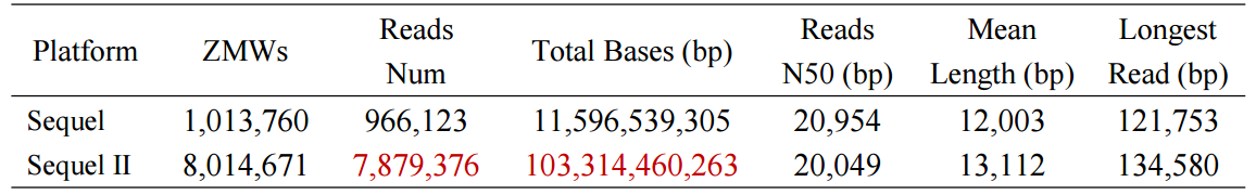 百邁客利用某海洋動物樣本通過構(gòu)建相同文庫,進行不同平臺的數(shù)據(jù)測試。通過構(gòu)建20 Kb的文庫,同時在Sequel與SequelⅡ上進行上機測序,數(shù)據(jù)產(chǎn)出結(jié)果如下所示: