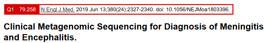 Wilson MR,Sample HA,Chiu CY,et al.Clinical Metagenomic Sequencing for Diagnosis of Meningitis and Encephalitis.N Engl J Med,2019.