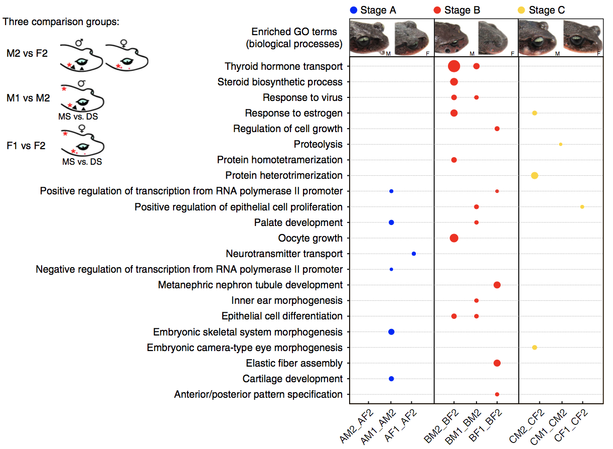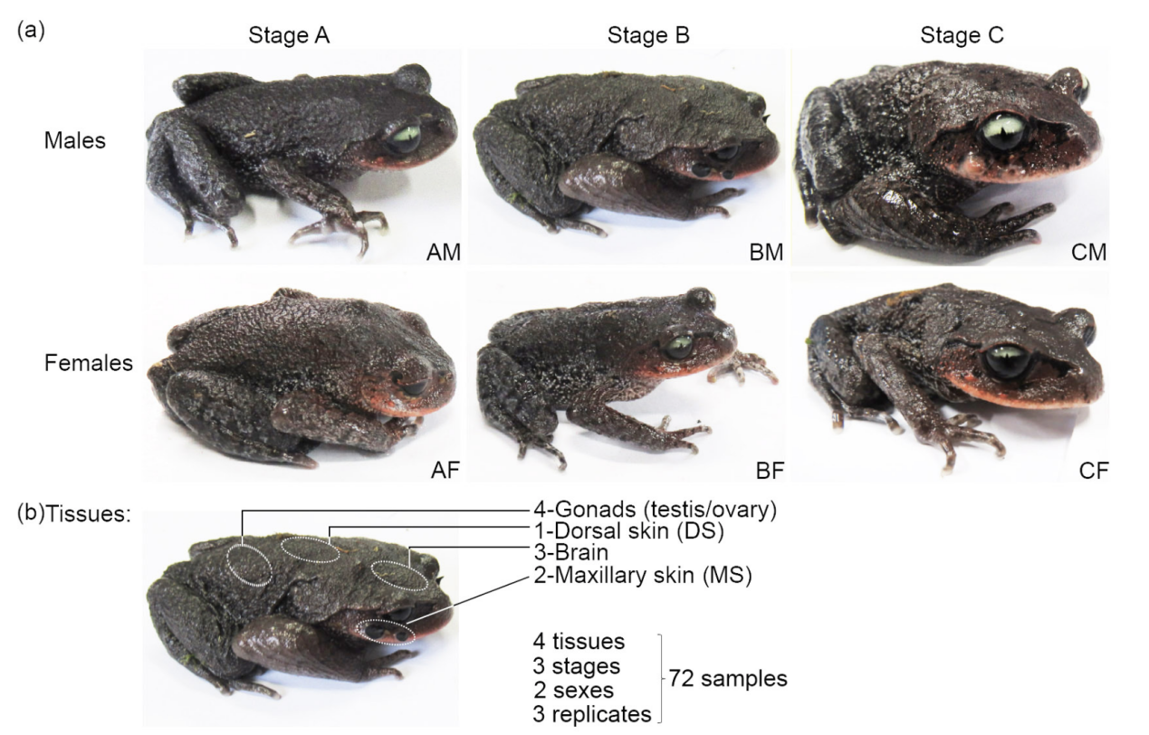 在雌雄異體的有性生物中,兩性之間在體型大小、形態(tài)結(jié)構(gòu)和功能等方面存在明顯差異的現(xiàn)象稱為性二態(tài)(Sexual dimorphism)。自然界普遍存在的性二態(tài)(如劍尾魚的劍狀尾和獅子的鬃毛等)一直是進(jìn)化生物學(xué)家關(guān)注的熱點(diǎn)問題。兩棲動物具有豐富的性二態(tài)特征,繁殖期的雄性雷山髭蟾在上頜的皮膚形成角質(zhì)刺,類似于人類的“胡子”,因此又被稱為“胡子蟾”,繁殖期過后,角質(zhì)刺外殼會脫落,而雌性則沒有這種特征。由于除了性染色體上的基因外,大多數(shù)的基因組在雄性和雌性之間是共享的,所以性二態(tài)往往是由基因在性別間差異性表達(dá)引起的。由于缺乏參考基因組,很少有研究能夠?qū)⑿詣e差異表達(dá)模式與特定的性二態(tài)特征聯(lián)系起來,與性二態(tài)性狀相關(guān)的重要生物學(xué)過程和關(guān)鍵基因也一直難以破解。本文成功的建立了一個具有代表性的鋤足蟾亞目基因組,并對其皮膚來源的性二態(tài)性狀進(jìn)行了分子基礎(chǔ)的研究。