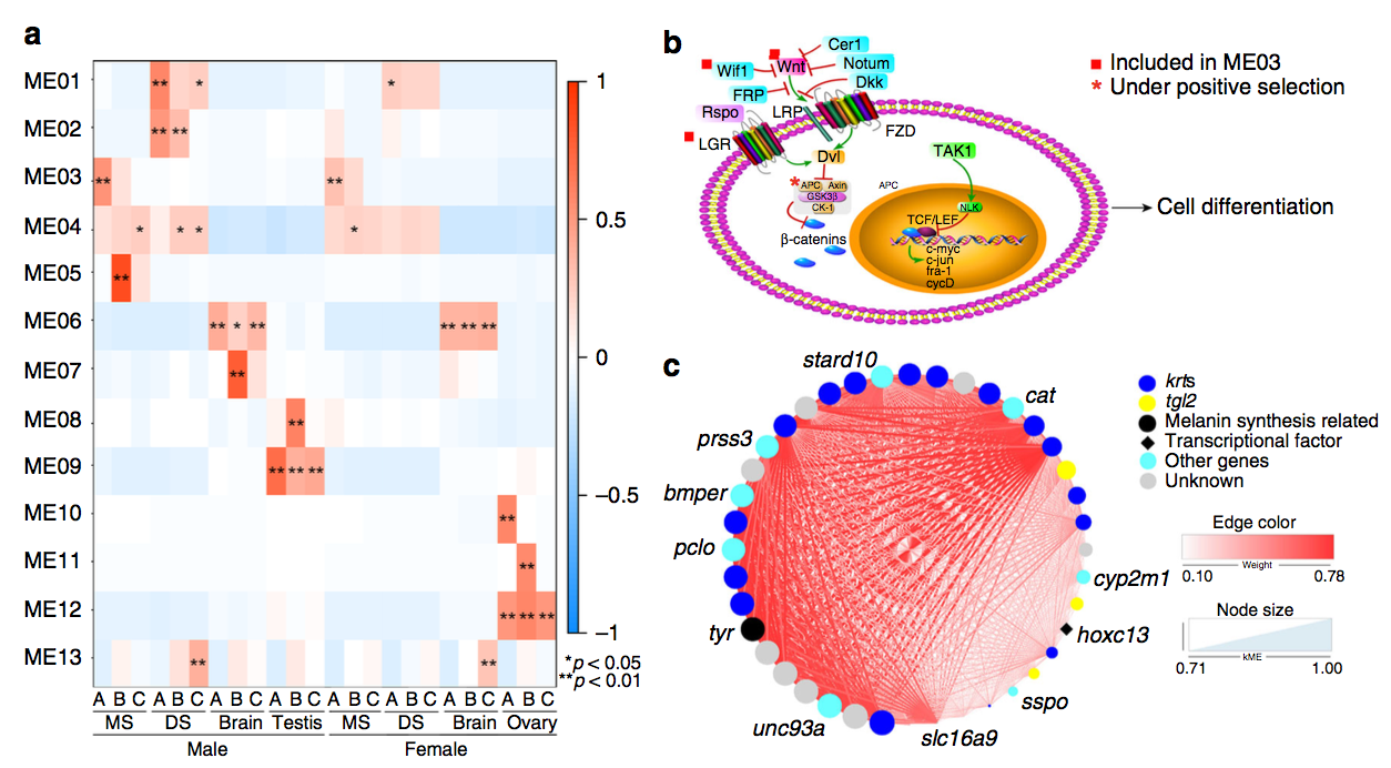 為了進(jìn)一步確定控制角質(zhì)刺生長的關(guān)鍵基因,研究者分析了基因共表達(dá)網(wǎng)絡(luò),并使用加權(quán)基因共表達(dá)網(wǎng)絡(luò)分析(WGCNA)鑒定了基因模塊(genetic module),試圖找出與特定性狀相關(guān)的模塊(可能表現(xiàn)出相同生物活性的高度相關(guān)基因)。共表達(dá)網(wǎng)絡(luò)揭示了Wnt通路、角蛋白基因krt、黑色素合成相關(guān)的酪氨酸酶基因tyr以及轉(zhuǎn)錄因子hoxc13等參與形成角質(zhì)刺結(jié)構(gòu)(圖10)。