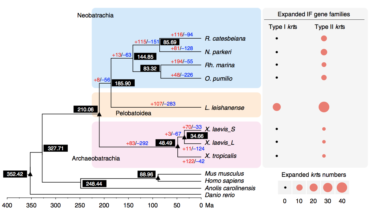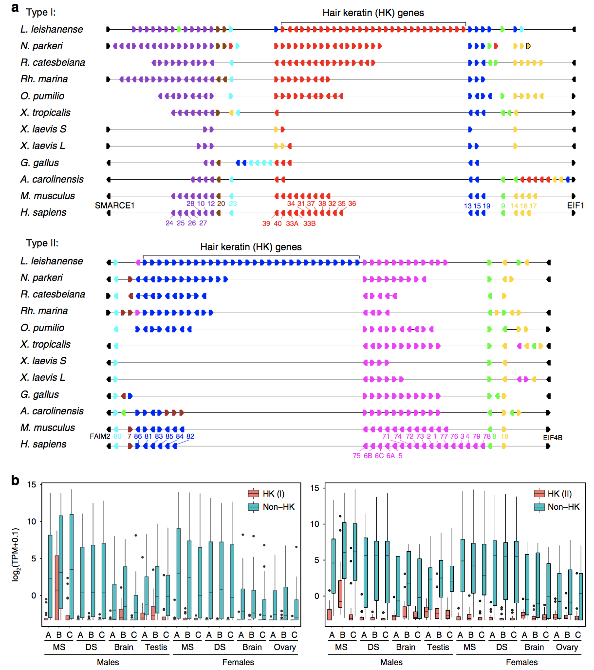 在擴(kuò)張的基因家族中,兩個編碼中間絲(Intermediate Filament, IF)蛋白的基因家族在L. leishanense基因組中顯著擴(kuò)張(圖6)。這兩種擴(kuò)張的基因家族包括編碼角蛋白的基因,角蛋白是上皮細(xì)胞的成絲蛋白,參與脊椎動物角質(zhì)化組織的形成,如人的頭發(fā)和指甲。在哺乳動物中,表皮堅(jiān)硬組織的一個重要組成部分是兩類α-角蛋白(稱為Ⅰ型和Ⅱ型α-角蛋白),基因組分析表明人類共有54個功能性角蛋白基因(28個Ⅰ型和26個Ⅱ型),分別聚集在兩條染色體上。在L. leishanense中,共鑒定出101個完整的α-角蛋白基因,包括53個I型和48個II型基因,這遠(yuǎn)遠(yuǎn)高于在其他物種中觀察到的此類基因的數(shù)量。通過比較α-角蛋白基因的基因組分布,發(fā)現(xiàn)Ⅰ型和Ⅱ型α-角蛋白基因分別聚集在L. leishanense的兩條染色體(Lle 12和Lle 2)上,而且側(cè)翼基因與其它脊椎動物的基因相同,暗示角蛋白基因序列的保守性。在哺乳動物(人和小鼠)和L. leishanense及其他無尾目動物中,存在多個物種特異性的角蛋白基因簇,這是角蛋白基因庫擴(kuò)大的主要原因(圖7a)。L. leishanense中發(fā)生串聯(lián)復(fù)制的角蛋白基因與哺乳動物的毛發(fā)角蛋白(Hair Keratins, HKs)同源(圖7a)。L. leishanense中HK同源基因的拷貝數(shù)幾乎是其他無尾類的兩倍(圖7a)。