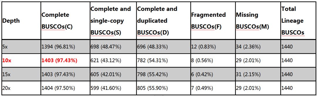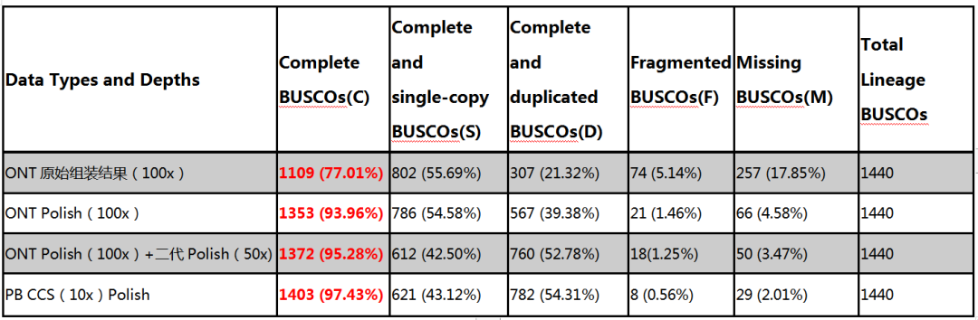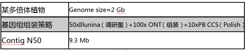 由于Nanopore測(cè)序Reads讀長(zhǎng)長(zhǎng),PacBio Sequel II HiFi模式測(cè)序準(zhǔn)確性高達(dá)99%以上,為了同時(shí)利用其雙平臺(tái)各自的優(yōu)勢(shì),我們擬通過(guò)Nanopore測(cè)序數(shù)據(jù)對(duì)某多倍體植物進(jìn)行基因組組裝,同時(shí)通過(guò)低深度PacBio CCS數(shù)據(jù)進(jìn)行Polish,進(jìn)而對(duì)該多倍體植物基因組連續(xù)性,完整性及準(zhǔn)確性進(jìn)行評(píng)估,以獲得高連續(xù)性,高準(zhǔn)確的基因組密碼信息,測(cè)試結(jié)果如下:
