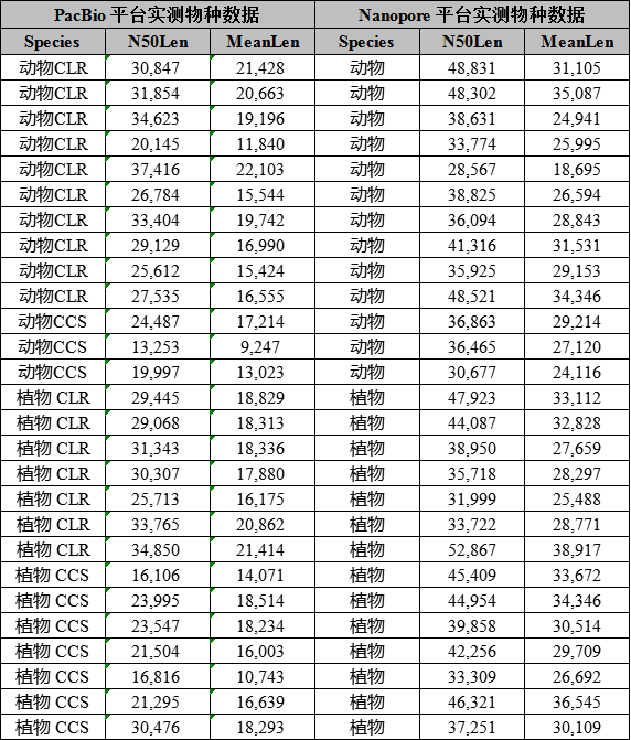 通過(guò)雙平臺(tái)實(shí)測(cè)數(shù)據(jù)的比較分析: Nanopore平臺(tái)平均讀長(zhǎng)為28.5 Kb左右,Reads N50平均讀長(zhǎng) 38Kb左右;PacBio CLR平均讀長(zhǎng)20 Kb左右,Reads N50平均讀長(zhǎng) 28Kb左右;CCS平均讀長(zhǎng)12-15 Kb,Reads N50 16~18Kb,發(fā)現(xiàn)Nanopore比PacBio平臺(tái)讀長(zhǎng)高10 Kb左右,而PacBio CCS模式讀長(zhǎng)遠(yuǎn)低于CLR模式。