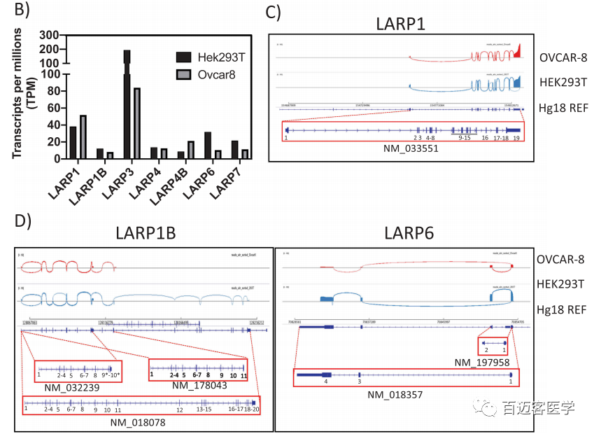 Nanopore全長(zhǎng)轉(zhuǎn)錄組測(cè)序:為了進(jìn)一步了解LARP1 isoform的表達(dá),在HEK-293 T和OVCAR-8細(xì)胞(永生化的人類胚胎腎細(xì)胞和卵巢癌細(xì)胞系)中分別進(jìn)行了牛津納米孔測(cè)序技術(shù)(ONT全長(zhǎng)轉(zhuǎn)錄組測(cè)序)(圖2B-D)。這種RNA直接測(cè)序技術(shù)可以檢測(cè)長(zhǎng)讀長(zhǎng)轉(zhuǎn)錄本isoform,并可以無(wú)PCR偏倚地定量轉(zhuǎn)錄本豐度。與人類基因組(Hg38)比對(duì),并使用IGV可視化。在HEK-293T細(xì)胞中,檢測(cè)到總共2,038,842個(gè)轉(zhuǎn)錄本,而在OVCAR-8細(xì)胞的樣品中僅檢測(cè)到1,834,870個(gè)轉(zhuǎn)錄本。(根據(jù)百邁客的項(xiàng)目經(jīng)驗(yàn)大概每個(gè)樣本2G多的數(shù)據(jù)量)作者對(duì)所有比對(duì)到7個(gè)LARP家族成員的轉(zhuǎn)錄本進(jìn)行表達(dá)定量,校正各樣本數(shù)據(jù)量差異將其標(biāo)準(zhǔn)化為TPM(transcripts per million,每百萬(wàn)轉(zhuǎn)錄本)(圖2B)。在LARP家族成員中,LARP3的轉(zhuǎn)錄本表達(dá)量最高(TPM=194)。相反,其他LARPs的表達(dá)值TPM遠(yuǎn)低于50,其中LARP1B和LARP4B的表達(dá)最低。且與前人研究一致,致癌性LARP1在OVCAR-8癌細(xì)胞(TPM 52)中的表達(dá)水平高于HEK-293 T細(xì)胞(TPM 38)中的表達(dá)水平。為了分析LARP1 sioform在這些細(xì)胞中的表達(dá),作者使用Sashima圖(圖2C)可視化剪接位點(diǎn)。使用這種RNA直接測(cè)序的nanopore全長(zhǎng)轉(zhuǎn)錄組方法,在2個(gè)測(cè)試的細(xì)胞系中均未檢測(cè)到SI-LARP1。盡管LARPs的表達(dá)水平低于其他基因,例如GAPDH(在OVCAR-8細(xì)胞中TPM高達(dá)6396),因此LI-LARP1被鑒定為主要表達(dá)的LARP1亞型。作者還觀察到5′截短的LARP1轉(zhuǎn)錄本積累,LARP1B的3種isoform共表達(dá)(NM-018078,NM_178043,NM-032239),LARP6的2種isoform共表達(dá)(NM_197958,NM_018357)(圖2D)。對(duì)于其他LARP,能夠確認(rèn)ONT測(cè)序檢測(cè)到的主要轉(zhuǎn)錄本與經(jīng)典isoform相對(duì)應(yīng)。