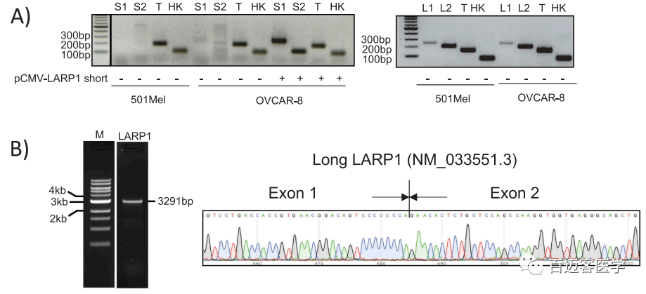 特異性引物擴(kuò)增及sanger測(cè)序驗(yàn)證實(shí)驗(yàn):為了驗(yàn)證ONT全長(zhǎng)轉(zhuǎn)錄組測(cè)序發(fā)現(xiàn)的LI-LARP1是主要isoform,作者設(shè)計(jì)了2對(duì)特異性引物,以通過(guò)PCR檢測(cè)短或長(zhǎng)LARP1 isoform或2種總和(使用保守的exon 7上的引物,此處稱為“總LARP1”)(圖3)。設(shè)計(jì)對(duì)應(yīng)于每個(gè)LARP1 isoform外顯子1的正向引物和下游外顯子的外顯子連接處的反向引物。這些引物有效性通過(guò)重組SI-LARP1或LI-LARP1表達(dá)后的成功擴(kuò)增得到證實(shí)。設(shè)計(jì)用于檢測(cè)總LARP1的引物,以在所有預(yù)測(cè)的isoform共有的第7外顯子上退火。結(jié)果發(fā)現(xiàn)LI-LARP1在501-MEL(黑色素瘤細(xì)胞系)和OVCAR-8細(xì)胞中表達(dá),但未檢測(cè)到SI-LARP1的PCR擴(kuò)增產(chǎn)物(圖3A)。對(duì)所有PCR產(chǎn)物進(jìn)行測(cè)序以驗(yàn)證所需的擴(kuò)增子。接下來(lái),設(shè)計(jì)了對(duì)長(zhǎng)LARP1 isoform(LI-LARP1)的開放閱讀框具有特異性的引物,并通過(guò)cDNA文庫(kù)中的PCR進(jìn)行了擴(kuò)增,PCR產(chǎn)物的sanger測(cè)序結(jié)果揭示了LI-LARP1預(yù)測(cè)的完整核苷酸序列,包括其特定的外顯子1(圖3B)。值得注意的是,所有試圖擴(kuò)增SI LARP1 isoform編碼序列的嘗試均告以失敗,表明該isoform在得到的cDNA文庫(kù)中不存在。