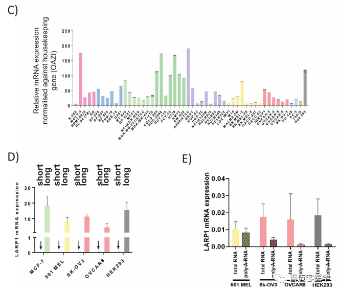 4、NCI-60幾種癌細(xì)胞系隨機(jī)引物及oligo dT反轉(zhuǎn)錄qPCR驗(yàn)證SI-LARP1和LI-LARP1 isoform表達(dá):長(zhǎng)LARP1 isoform(LI-LARP1)在廣泛的癌癥和正常細(xì)胞中是主要表達(dá)的形式,而SI-LARP1 mRNA(如果表達(dá)的話)以低水平和不成熟的形式存在。