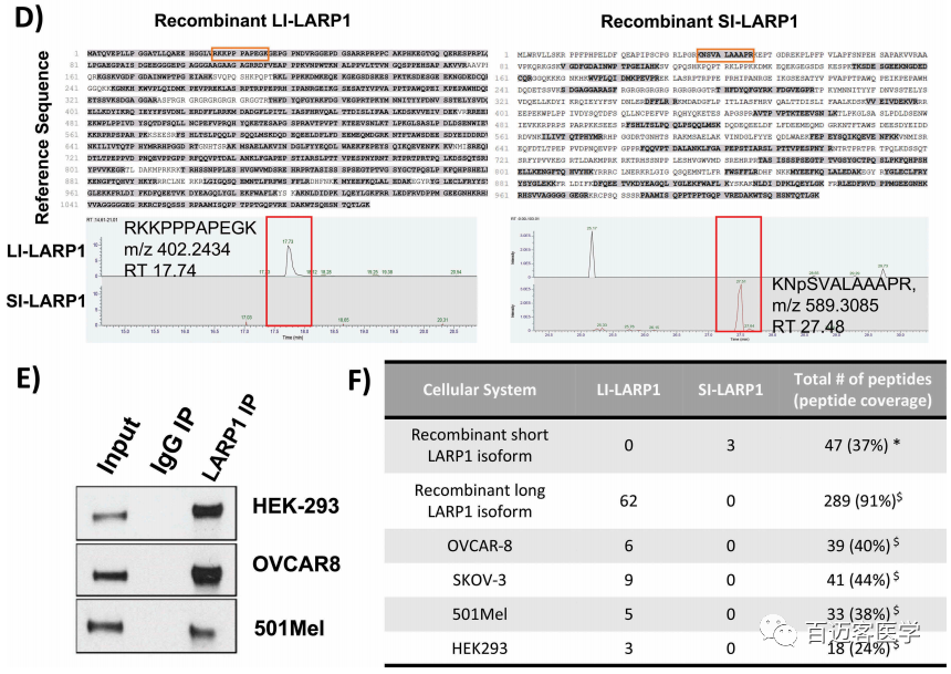 為了驗(yàn)證這一點(diǎn),首先,在OVCAR-8細(xì)胞中異位表達(dá)了2種LARP1 isoform,并使用針對(duì)共表達(dá)的Xpress標(biāo)簽的抗體從粗蛋白裂解物中免疫沉淀富集LARP1蛋白(圖4C)–pull down實(shí)驗(yàn)。隨后,使用胰蛋白酶或胰凝乳蛋白酶對(duì)樣品進(jìn)行溶液消化后,Shotgun LC MS/MS質(zhì)譜分析以鑒定對(duì)應(yīng)于SI-或LI-LARP1 isoform的N端特異性肽段。鑒定了從序列位置45和46產(chǎn)生的3種肽(質(zhì)量為N46SVALAAAPR:485.2773 Th(m/z); K45NpSVALAAAPR:549.3257 Th(m/z); K45NSAVALAAAPR:589,3085 Th(m/z ))作為SI-LARP1的唯一特征(圖4D)。相反,對(duì)于LI-LARP1,鑒定了由與外顯子1對(duì)應(yīng)的蛋白質(zhì)序列產(chǎn)生的152個(gè)肽。第二步,免疫沉淀富集OVCAR-8、501-MEL、SK-OV-3和HEK-293T細(xì)胞的內(nèi)源LARP1,并進(jìn)行質(zhì)譜分析,使用監(jiān)督自動(dòng)算法檢測(cè)預(yù)先指定的isofrom特異性肽(圖4E-F)。LARP1的肽覆蓋率范圍為內(nèi)源性免疫沉淀蛋白的24-44%。盡管在所有4個(gè)細(xì)胞系中都鑒定出了與LI-LARP1 N端相對(duì)應(yīng)的獨(dú)特肽,但我們無(wú)法在任何樣品中鑒定出對(duì)SI-LARP1亞型具有特異性的任何肽。這些結(jié)果與觀察到的不存在對(duì)應(yīng)于SI-LARP1的mRNA相一致。