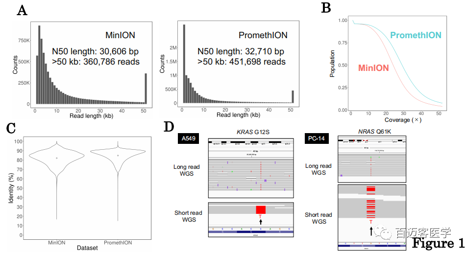 PromethION vs MinION:為了探究PromethION測序是否與MinION測序兼容,比較了獲得的兩個數(shù)據(jù)集的特征。Reads長度的總體分布是相似的(圖1A)。這兩個數(shù)據(jù)集都包含很大一部分超過50 kb的長讀長reads(MinION:360,786個讀,PromethION:451,698個),20X以上測序深度覆蓋了超過50%的人類基因組區(qū)域(圖1B),兩個數(shù)據(jù)集均顯示了超過80%的整體保真度(圖1C),與先前的研究相似。PromethION平臺各項指標稍微好一點。結(jié)論:PromethION是用于整個癌癥基因組測序的有效分析方法。
