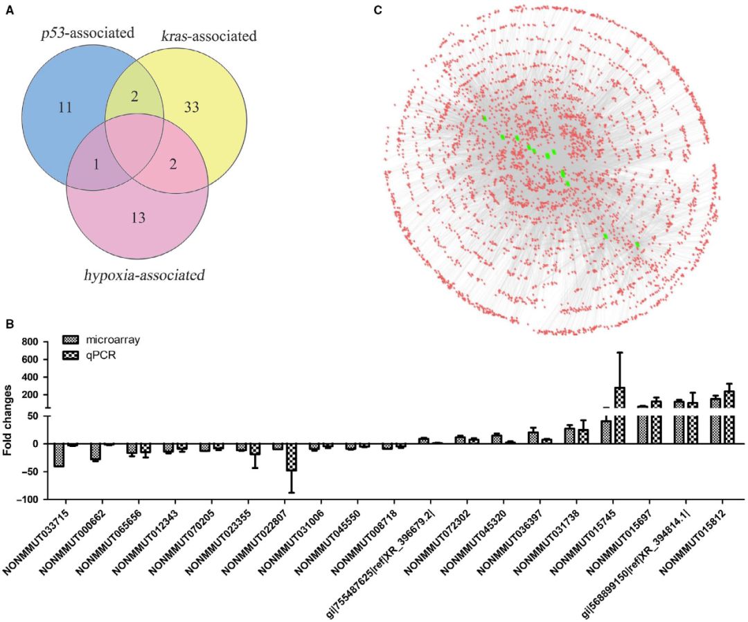 缺氧是實(shí)體腫瘤的一個(gè)顯著特征,低氧腫瘤通常對(duì)傳統(tǒng)的癌癥治療有抵抗力,且腫瘤低氧與晚期惡性腫瘤和轉(zhuǎn)移相關(guān)。作者進(jìn)一步研究了低氧調(diào)節(jié)的潛在的lncRNAs。將KP細(xì)胞在常氧(20% O2)和缺氧(1% O2)中培養(yǎng)48h,WB結(jié)果顯示缺氧可有效上調(diào)KP細(xì)胞HIF1α的表達(dá)(圖A)。RT-PCR結(jié)果顯示,缺氧誘導(dǎo)的KP細(xì)胞中有13個(gè)lncRNAs表達(dá)下調(diào),4個(gè)lncRNAs在缺氧誘導(dǎo)下表達(dá)上調(diào),其表達(dá)變化方向與小鼠肺腺癌組織芯片中的表達(dá)變化方向一致(圖B)。