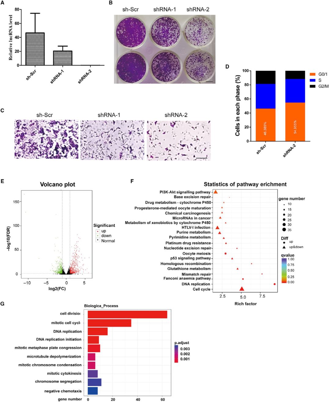 通過設(shè)計(jì)慢病毒介導(dǎo)的shRNAs來下調(diào)NONMMUT015812的表達(dá),qPCR結(jié)果顯示其可使KP細(xì)胞中NONMMUT015812的表達(dá)減少80%以上(圖A)??寺⌒纬蓪?shí)驗(yàn)顯示,NONMMUT015812基因的敲除顯著抑制了KP細(xì)胞的生長(圖B)。此外,在Transwell實(shí)驗(yàn)中,穩(wěn)定的NONMMUT015812基因敲除的KP細(xì)胞與對(duì)照細(xì)胞相比遷移明顯減少(圖C)。流式細(xì)胞術(shù)分析表明,NONMMUT015812基因敲除導(dǎo)致KP細(xì)胞明顯阻滯于G0/G1期,G2/M期細(xì)胞數(shù)量減少(圖D)。而NONMMUT015812基因敲除對(duì)細(xì)胞凋亡無明顯影響。