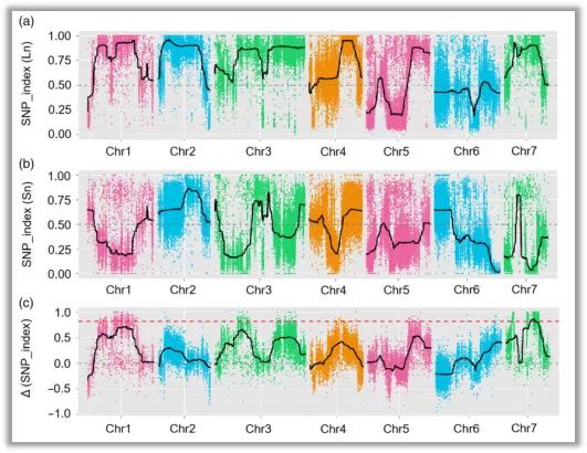 作者在1231個(gè)F2群體(Jin5-508 × YN)選擇了長(zhǎng)把和短把單株各50個(gè),構(gòu)建2個(gè)極端性狀DNA混池,對(duì)該混池及雙親進(jìn)行高通量測(cè)序及BSA分析。親本測(cè)序深度分別為34x(Jin5-508)和20x(YN),混池測(cè)序深度分別為61x和52x。測(cè)序數(shù)據(jù)與黃瓜參考基因組9930比對(duì),2個(gè)混池分別開(kāi)發(fā)了342,496和399,764個(gè)SNP,基于SNP index算法,在chr7上定位到一個(gè)主效QTLFnl7.1?(閾值0.833),區(qū)間范圍9.98–14.61 Mb(圖2c)。
