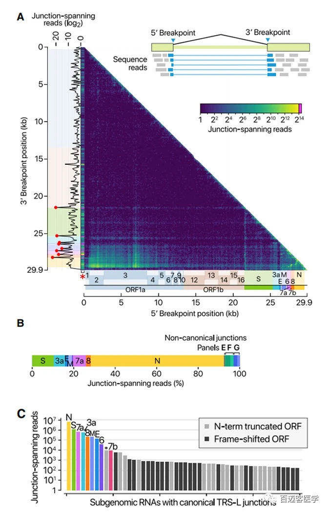 這篇文章結合了兩種測序方法,Direct RNA sequencing (DRS)和sequencing-by-synthesis (SBS),明確地繪制了SARS-CoV-2的亞基因組RNA(subgenomic RNAs),ORF和轉錄調控序列(TRS)。同時發(fā)現(xiàn)了許多與常規(guī)TRS介導的聚合酶跳躍不同的非常規(guī)RNA融合事件。發(fā)現(xiàn)了RNA修飾位點,并測量了gRNA和sgRNA的poly(A)的長度。
