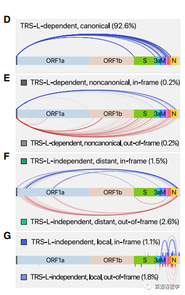 SARS-CoV-2除了具有預期結構和長度的經典sgRNA(圖4D),結果還顯示出許多次要的junction sites(圖4E–4G)。這種融合事件有三種主要類型。第一組中的RNA在位于ORF或UTR中間非預期的3’位點,前導序列(leader)與下游編碼序列(body)結合(圖4E,TRS-L-dependent noncanonical)。第二組顯示了與前導序列沒有相似性的序列之間的遠距離融合(圖4F, TRS-L-independent distant)。最后一組局部融合,這導致較小的缺失,主要發(fā)生在結構基因和輔助基因中,包括S ORF(圖4G,TRS-L-independent local recombination)。