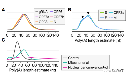 由于納米孔DRS基于RNA的單分子檢測,因此它提供了獨特的機會來檢查單個RNA分子的多個轉錄組特征。本文使用自己開發(fā)的軟件根據(jù)DRS數(shù)據(jù)來測量ploy(A)尾的長度(Y. Choi and H.C., unpublished data)。使用此軟件測量發(fā)現(xiàn),與其他CoV一樣,SARS-CoV-2 RNA帶有ploy(A)尾(圖5A–5B)。病毒RNA尾的中位長度為47 nt。全長gRNA的尾巴比sgRNA更長。值得注意的是,sgRNA具有兩個種群:一個在30 nt處的小峰和一個在45nt處的主峰(圖5B,箭頭)。之前研究發(fā)現(xiàn) bovine CoV mRNA的ploy(A)尾長度在感染過程中發(fā)生了變化,在這項研究中觀察到的30 nt的短尾可能代表易于衰變的老化RNA。與宿主核基因組編碼的mRNA不同,病毒RNA具有均勻的長度分布(圖5C)。