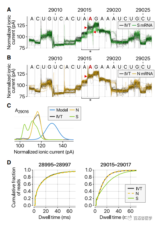 研究人員用DRS數(shù)據(jù)檢測了SARS-CoV-2的表觀轉錄組學。病毒RNA修飾在40多年前就已描述過(Gokhale and Horner,2017)。為了明確研究RNA修飾,作者通過體外轉錄病毒序列生成了陰性對照RNA,并對陰性對照進行了直接RNA測序。注意到陰性對照和病毒轉錄本之間的離子電流之間的差異非常有趣(圖6A)。至少有41個位點顯示出實質性差異(頻率超過20%),表明存在潛在的RNA修飾位點。值得注意的是,某些位點顯示的頻率取決于sgRNA的種類。圖6A–6C,S RNA上比N RNA修飾的位點更多,與S RNA相比ORF8 RNA上的修飾頻率更高。此外,修飾的堿基(圖6D,右)的停留時間比未修飾的堿基(圖6D,左)的停留時間長,表明修飾會干擾RNA分子過孔速度。