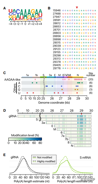 在41個潛在的修飾位點中,最常見的motif是AAGAA(圖7A和7B)。在整個病毒基因組中都發(fā)現(xiàn)了“AAGAA-like”motif的修飾位點(包括AAGAA和其他富含A/G的序列),尤其是在基因組28,500-29,500處特別豐富(圖7C)。病毒長的轉錄本(gRNA,S,3a,E和M)比短RNA(6、7a,7b,8和N)的修飾頻率更高(圖7D),表明該修飾是特定于某些RNA種類。因為DRS可以同時檢測單個分子上的多個特征,所以作者交叉檢測了poly(A)尾長和內部修飾位點。有趣的是,修飾的RNA分子的poly(A)尾比未修飾的短(圖7E)。這些結果表明內部修飾和3’尾之間存在聯(lián)系。由于poly(A)尾巴在RNA周轉中起重要作用,因此很容易推測所觀察到的內部修飾與病毒RNA穩(wěn)定性控制有關。