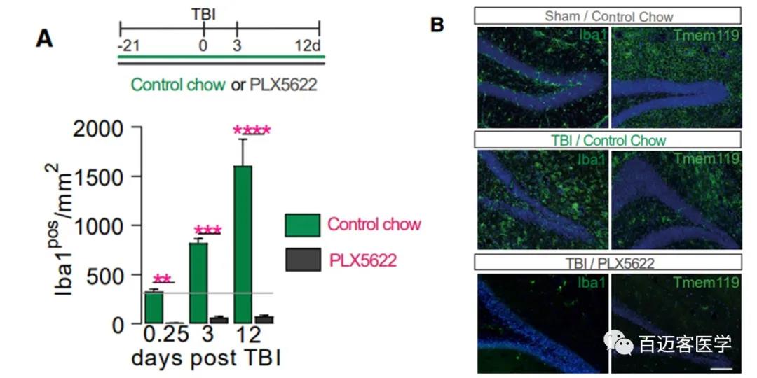 首先通過喂食小鼠集落刺激因子-1受體(CSF-1R)拮抗劑PLX5622 ,使小膠質(zhì)細胞衰竭,來檢查外傷性腦損傷(TBI)后小膠質(zhì)細胞缺失是否會改變海馬依賴任務(wù)中的認知結(jié)果。用可控皮質(zhì)撞擊造成TBI,在腦外傷前3周開始持續(xù)給藥PLX5622,可導(dǎo)致大范圍的Iba1pos?、TMEM119pos細胞的丟失,包括海馬區(qū)。在腦外傷后的整個實驗時間內(nèi),海馬區(qū)保持95%的功能缺失。這些結(jié)果與喂食食物的小鼠對照組形成鮮明對比。在腦外傷后的12天內(nèi),海馬內(nèi)的Iba1pos細胞數(shù)量是假手術(shù)組的5倍。