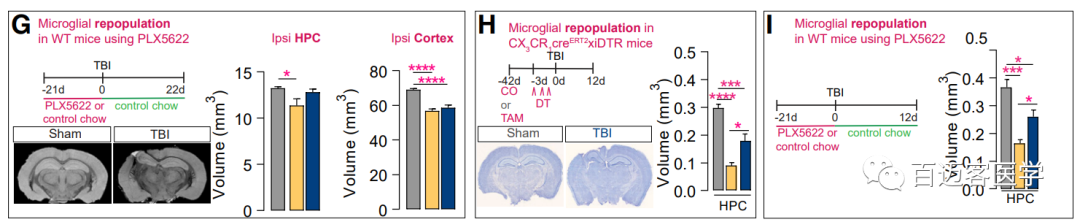 研究還發(fā)現(xiàn),經(jīng)歷過小膠質(zhì)細胞耗竭和再生的小鼠的大腦海馬組織體積更大(圖3G-I)。
