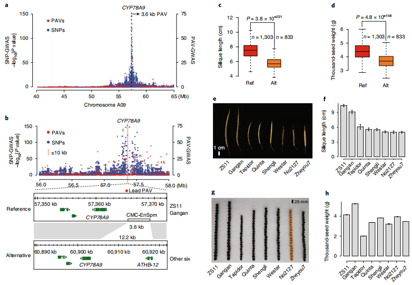 泛基因組可以結(jié)合GWAS數(shù)據(jù),有效提高GWAS 的準(zhǔn)確性,捕獲到更加完整的遺傳變異信息。通常,GWAS分析是將個體材料與參考基因組進行比對,然后將得到的 SNP 與表型進行關(guān)聯(lián)分析,當(dāng)GWAS 分析參考基因組不存在的功能基因引起的表型時,會出現(xiàn) GWAS 定位區(qū)間與實際功能基因之間較大偏差甚至檢測不到的情況。但以泛基因組為參考基因組,把結(jié)構(gòu)變異作為基因型數(shù)據(jù)用于 GWAS 分析,可以有效解決這類因單一參考基因組而導(dǎo)致的信息不全問題。例如,油菜以泛基因組鑒定到的 PAV 為基因型進行GWAS 分析,直接鑒定到基因BnaA9.CYP78A9啟動子區(qū)存在一段 3.9 kb 的插入,該變異嚴(yán)重影響油菜的角果長和粒重[2]。結(jié)構(gòu)變異相關(guān)的GWAS研究更具有新意,也是后續(xù)研究的熱點。