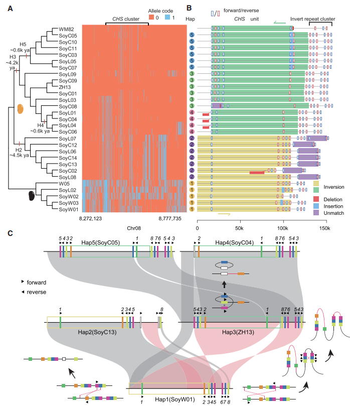 泛基因組擁有群體完整的基因組多樣性,可以為植物進化與馴化研究提供更完整、更寬泛的支持。如大豆的種皮顏色是大豆馴化過程中的一個重要表型性狀,從野生大豆的黑色種皮演變成栽培大豆的黃色種皮,是因為一個查爾酮合成酶基因發(fā)生序列倒置或序列復(fù)制后倒置導(dǎo)致了該基因沉默。通過大豆泛基因組單倍體型進化分析,將29份材料分為5個主要的單倍型(H1- H5),并對不同單倍體型馴化時間和順序進行了研究,剖析了大豆種皮顏色馴化的歷史[3]。