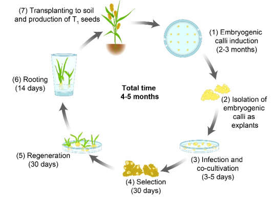 用HPT或NPTII標記的13個獨立轉基因系的基因組測序證實了轉基因插入“小米”基因組的正確性,并通過PCR進一步確定了3個檢測系的T-DNA插入位點。在盆栽中培育了代表8個轉基因事件的T1植株,觀察到與未轉化的“小米”植株沒有明顯的表型差異。因此,研究者建立了一個有效的方案,允許在2-3個月內(nèi)(從農(nóng)桿菌感染算起)或4-5個月內(nèi)(從成熟種子開始愈傷組織算起),完成生產(chǎn)準備移植到土壤中的轉基因植物(圖9)。