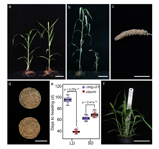 “小米”主要有以下特征:(1)表現(xiàn)出極早的開花表型:抽穗期39天(播種后天數(shù),DAS)左右,約70天內(nèi)完成了生命周期。而野生型(晉谷21,WT)的平均抽穗期約為82 天(DAS),成熟期為130 DAS(圖1b、c);(2)“小米”比野生型矮(圖1b),但結實率高12.83%,且種子大小沒有顯著差異(圖1d);(3)“小米”在短日(SD,10h光照/14h暗)條件下比長日(LD,16h光/8h暗)條件下的抽穗晚了約一個月,表明“小米”的早期抽穗依賴于LD條件(圖1e)。通過延長日長和優(yōu)化其他條件,可以將“小米”的生命周期縮短到65天,株高約為29厘米(圖1f),每年可以在成長室里完成5到6代。(4)僅需較小的種植面積,類似于種植等量的擬南芥植株。
