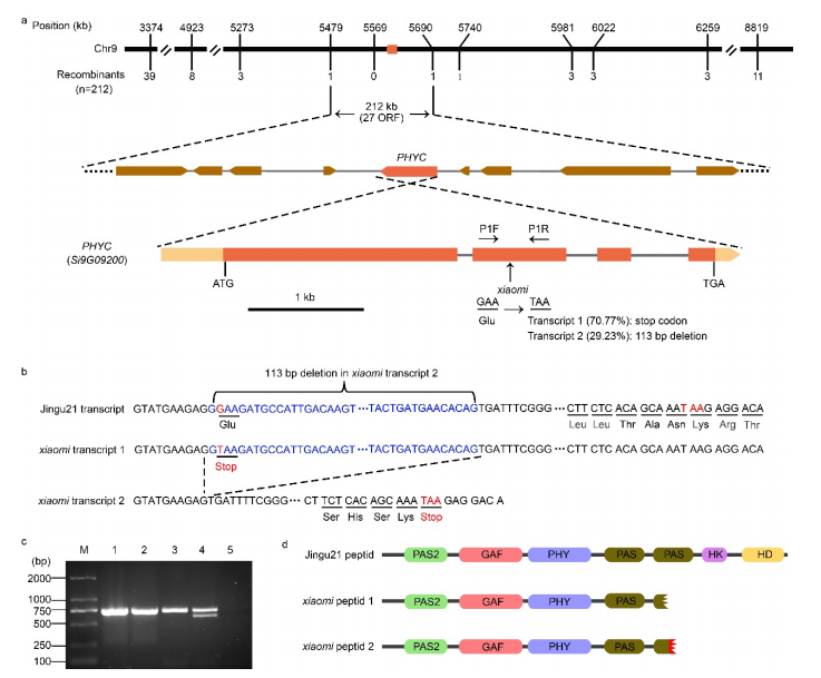 將“小米”基因組序列與經(jīng)基因組重測序生成的晉谷21基因組序列進行比較,發(fā)現(xiàn)在定位區(qū)域只存在一個突變——“小米”基因Si9g09200的編碼區(qū)從“G”到“T”的突變,該基因編碼一種假定的PHYC蛋白(圖2a)。在所檢測的77個早期抽穗F2個體中,均為T/T純合突變體。相比之下,在256個晚抽穗個體中,92個是G/G WT純合子,另外164個是G/T雜合子,反映了基因型和表型之間的完美關聯(lián)。這種突變產(chǎn)生了一個終止密碼子,形成一個截短的蛋白質,占該基因約71%的轉錄本(轉錄本1)(圖2a-d)。這一突變還導致了113 bp的移碼缺失的剪接,形成了占該基因約29%轉錄本(轉錄本2)的截短蛋白(圖2a-d)。根據(jù)預測,被截斷的蛋白質缺少第二個PAS結構域的三分之二(肽1)或三分之一(肽2),以及整個HK和HD域(圖2d)。