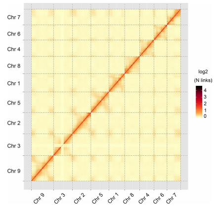 為了便于“小米”作為模型植物的使用,使用PacBio平臺組裝出429.94 Mb基因組 v1.0(k-mer預估438.26 Mb),contig N50高達18.8?Mb,Scaffold N50為42.41 Mb,并且僅包含48個Gap。其中399.4 Mb通過Hi-C錨定在9條染色體上(掛載率~93%;圖5)。根據(jù)Illumina DNA比對,組裝的錯誤率約為0.001%(每100kb有一個錯誤)。BUSCO評估結果為97.78%。這些結果表明“小米”基因組v1.0可以作為研究界的金標準參考。