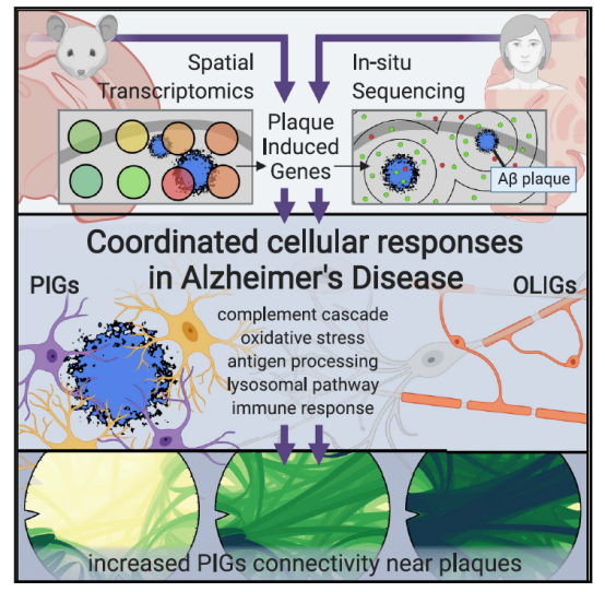 簡述:本文結(jié)合空間轉(zhuǎn)錄組(ST)和原位測序(ISS)研究人鼠大腦,揭示了兩種由淀粉樣蛋白斑沉積誘導(dǎo)的的阿爾茲海默癥(AD)多細胞基因網(wǎng)絡(luò)—-斑塊誘導(dǎo)基因(PIG)網(wǎng)絡(luò)和少突膠質(zhì)細胞基因(OLIG)響應(yīng)。