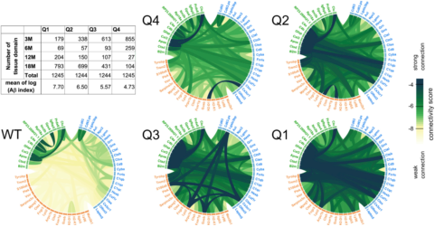 在WT中,所有PIGs的關(guān)聯(lián)相對較低,PIG被分為三個簇(圖5,綠、藍、橙)。ISS實驗(圖4H)證明了在綠色簇中,星形膠質(zhì)細胞基因(7/12)富集,而藍色(14/23)和橙色(14/28)簇聚集了小膠質(zhì)基因中表達的PIGs。在WT中,橙色的PIGs幾乎不關(guān)聯(lián),而AppNL-G-F小鼠中,在接觸增長的Aβ后,這些PIGs的基因被招募。隨著Aβ指標(biāo)增長,PIGs內(nèi)部和相互之間的關(guān)聯(lián)增強。在Q4-Q1中,隨蛋白斑積累程度增加,互作關(guān)系明顯增加。