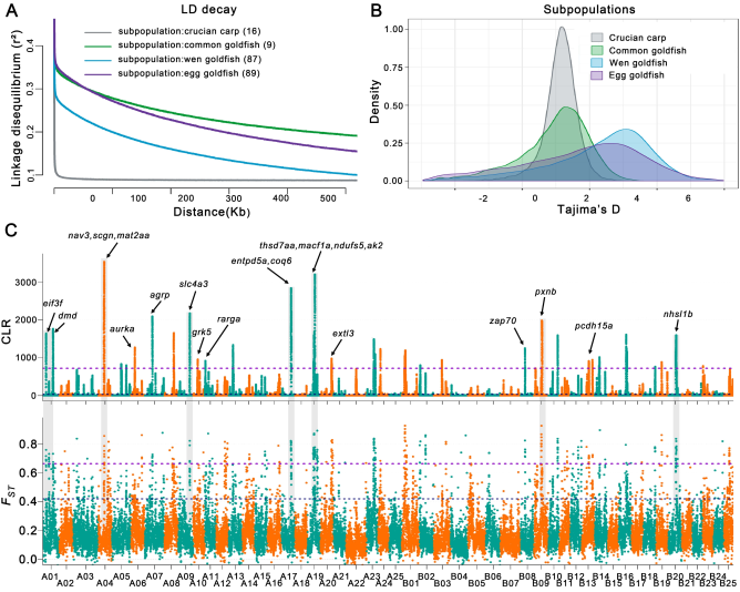 LD及群體選擇分析支持了前期的假設,即金魚馴化過程中種群遺傳瓶頸效應的存在和強烈的人工選擇(圖5 A)。進一步的遺傳多樣性分析發(fā)現,由于人工選擇的結果,從鯽魚和普通金魚的馴化過程中遺傳多樣性的增加,表明了從鯽魚馴化后,金魚重要遺傳變異的積累(圖5 B);33個金魚個體和16個野生鯽魚個體的群體選擇分析發(fā)現了50個受選擇區(qū)域(25.2 Mb區(qū)間內,共計946個基因)(圖5 C),940個候選基因中大部分與形態(tài)發(fā)生,色素沉著,行為,免疫反應/傳染病,能量代謝和對激素的反應有關;進一步通過以上201個個體的選擇性清除分析發(fā)現393個基因受選擇,其中21個代表性候選基因中,有13個與在斑馬魚中存在敲除系的基因同源,這些敲除系顯示與行為相關的突變表型(pcdh15aagrp),眼睛大小減?。?em>ndufs5),細胞遷移(nav3zap70)或腦大小減?。?em>aurka)。