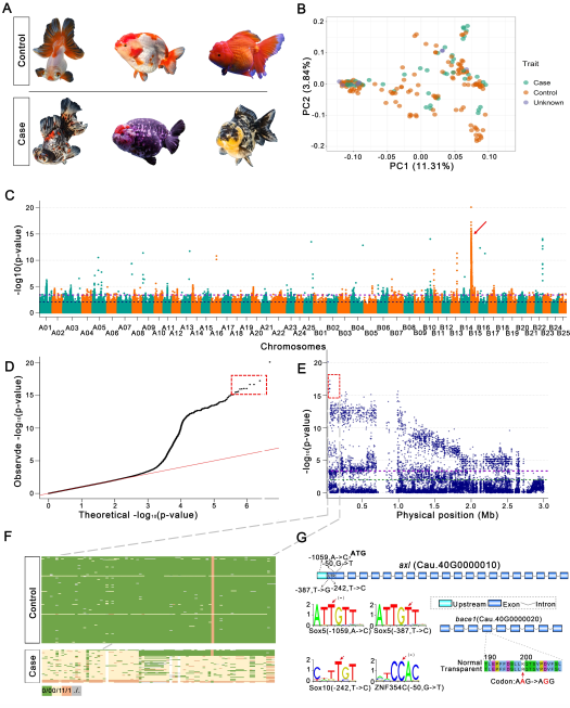 ??? 透明的金魚突變體首次記錄于1579年,是孟德爾遺傳學在魚類甚至脊椎動物中的典型案例,在T / t基因座上的優(yōu)勢表達不完全。本研究中利用48個實驗個體和127個對照個體進行全基因組關聯分析(圖7 A-C),發(fā)現在B15染色體臂上的5個SNPs與T / t基因座上的不完全優(yōu)勢遺傳模式相吻合。與同源染色體15相比,在該區(qū)域發(fā)生了倒位。在候選區(qū)域ChrB15:28,558?153,105中,鑒定了基因Cau.B15G0000010(ChrB15:48,888?76,549),其編碼酪氨酸蛋白激酶受體UFO-like蛋白,在5′-UTR區(qū)的預測轉錄因子結合位點包含四個SNPs(圖7 G)。白細胞酪氨酸激酶與斑馬魚的色素細胞發(fā)育有關,并且受體酪氨酸激酶家族的成員在人類黑色素瘤的發(fā)育中起著作用,盡管目前該基因家族的作用在金魚中尚不清楚。在金魚中,酪氨酸蛋白激酶受體可能調節(jié)酪氨酸激酶,從而導致色素沉著變化,在該區(qū)域內,編碼具有非同義單核苷酸突變的β-分泌酶1-like蛋白(bace1)的Cau.B15G0000020基因與斑馬魚和人的黑素細胞遷移有關,這可能解釋在透明鱗片的金魚上出現黑色污跡或斑點。盡管功能驗證仍在進行中,但研究中認為酪氨酸蛋白激酶受體是金魚T / t基因座的強力候選基因。