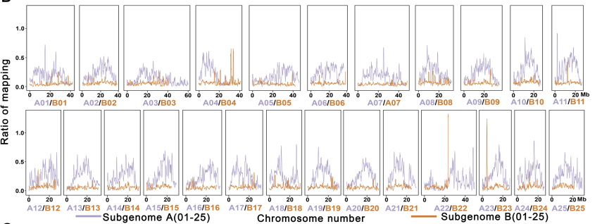 在過去的50年里,一直推測金魚基因組是四倍體。近期研究表明,鲃亞科Barbinae (2n = 50) 中的鯉魚科可能是金魚最接近的二倍體祖先,進而形成這樣一個假說:鲃亞科(Barbinae)可能是二倍體金魚譜系的祖先種,研究中進一步進行了6個代表性的二倍體鲃亞科物種(包括條紋小鲃,大鱗高須魚,長臀鲃,黑鰭袋唇魚,施氏魮和裂峽鲃)的全基因組鳥槍測序并進行基因組組裝。金魚染色體可清晰分為兩個亞基因組,通過reads多序列比對,發(fā)現金魚來自兩個祖先世系,其中一個是鲃亞科共有的,進一步將與鲃亞科比例高的reads所在染色體定為A亞基因組(ChrA01~A25)并將其余染色體定為B亞基因組 (ChrB01~B25)(圖2)。此外,基于1個核基因的系統(tǒng)進化分析,即結締組織生長因子like基因在二倍體金魚中僅有1個拷貝,但在四倍體金魚中含有2個拷貝,結果顯示鲃亞科物種的同源基因與金魚A亞基因組同源基因聚類到一起(斑馬魚和鯉魚作外群)。研究結果表明,A亞基因組可能起源于鲃亞科內的祖先物種,而B亞基因組的二倍體祖先可能已經滅絕或起源于未知的鯉科魚類譜系,推測金魚的起源可能是由于異源多倍化事件。金魚的A和B亞基因組分別包含28,133和26,141個基因。同時通過金魚10個不同組織的RNA-seq測序,探索了A和B兩個亞基因組之間的差異表達,發(fā)現同源基因在兩個亞基因組之間表現出不對稱的表達模式,而全基因組范圍內的表達水平總體上更偏好A亞基因組。
