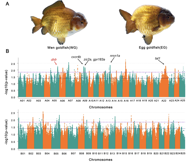 背鰭作為金魚一重要的表型特征,在不同變種中形態(tài)不一,背鰭是區(qū)分Wen金魚和Egg金魚的顯著特征,背鰭的縮小是Egg金魚進化的關鍵特征。通過Wen金魚和Egg金魚雜交后代F1背鰭性狀分離比,暗示了了背鰭特征受多個基因位點控制,可能具有母體遺傳效應。對96只有背鰭和87只無背鰭金魚的全基因組關聯分析GWAS研究分析發(fā)現跨越13條染色體上的8.96 Mb區(qū)域上的378個基因與背鰭性狀相關(圖6),85.2% (322)個基因位于A亞基因組,大部分位于五條染色體上,包括ChrA09,ChrA07,ChrA22,ChrA16和ChrA05,比位于B亞基因組上的背鰭相關基因的數量高得多,這表明背鰭相關基因不對稱的亞基因組分布,GO和KEGG分析表明,該性狀的候選基因可能參與了“細胞表面受體信號傳導”途徑,“信號轉導”,“跨膜轉運”,“骨骼系統(tǒng)發(fā)育”和“初級代謝過程和器官氮化合物代謝過程”。進一步通過與斑馬魚直系同源基因基因敲除品系表現出的突變表型分析發(fā)現,二氫葉酸還原酶(dhfr)可能在某種程度上與魚鰭是否存在相關,該基因可能在金魚人工選擇過程中,在有無背鰭這一表型中發(fā)揮重要作用。
