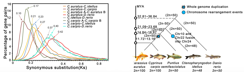 在同源染色體對ChrA01/ChrB01, ChrA04/ChrB04, ChrA05/ChrB05, ChrA09/ChrB09, ChrA11/ChrB11和ChrA15/ChrB15上出現了大片段倒位,盡管整體共線性很強。這些大的片段倒位可能是異源四倍體形成的原因之一。進一步發(fā)現,金魚兩個亞基因組(Ks= ~0.17)與鯉魚(Ks= ~0.21)之間的分歧時間(13.28-16.67 MYA),早于金魚和鯉魚之間的分歧時間(7.81?8.77 MYA)(Ks =?0.10)(圖3 A)。此外,文中假設全基因組復制(WGD)事件發(fā)生在金魚和鯉魚的共有譜系中,因此它們可能具有相同數量的染色體(2n = 100),染色體基數(2n=50)是二倍體鯉亞科成員的兩倍,暗示這兩個種都是四倍體。同時,發(fā)現斑馬魚于~ 32.8-36.8 MYA,與鯽魚、鯉魚和草魚由共同的祖先(LCA)分化而來(圖3 B)。