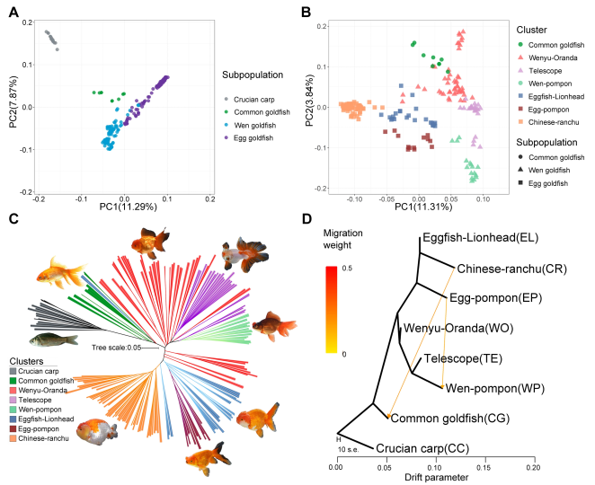 通過201個個體(16只野生鯽魚和185只代表性金魚變種,平均測序深度12.5 x)的系統(tǒng)發(fā)育樹構建發(fā)現普通金魚與鯽魚親緣關系最近(圖4 A-C),進一步結合系統(tǒng)發(fā)育樹和PCA分析確定各金魚變種的系統(tǒng)分化關系,區(qū)分普通金魚和卵金魚(無背鰭)和溫金魚(有背鰭),無背鰭金魚和有背鰭金魚進一步分為不同的亞群。