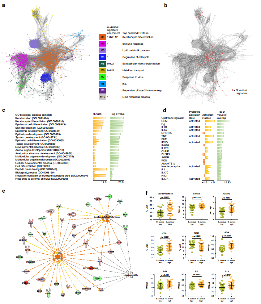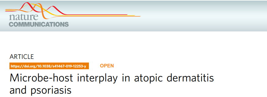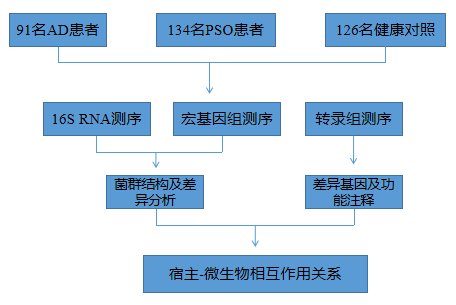 本文通過16S RNA測(cè)序、宏基因組測(cè)序及轉(zhuǎn)錄組測(cè)序技術(shù)研究了特異性皮炎和銀屑病患者皮膚微生物群落結(jié)構(gòu)以及皮膚基因表達(dá)模式。發(fā)現(xiàn)特異性皮炎和銀屑病與健康對(duì)照皮膚微生物組成存在顯著差異。特異性皮炎以金黃葡萄球菌為主并與宿主皮膚屏障功能、色氨酸代謝和免疫激活相關(guān)。銀屑病皮膚微生物群落與宿主基因表達(dá)存在微弱的關(guān)聯(lián)性。并為皮膚生態(tài)失調(diào)的生物標(biāo)志物和靶向治療提供基礎(chǔ)。