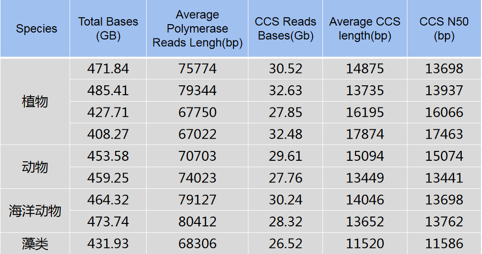 百邁客自2019年引進PacBio SequelⅡ平臺以來,在HiFi測序方面已經(jīng)積累了大量的經(jīng)驗,在技術(shù)人員的不斷優(yōu)化下,HiFi文庫單cell產(chǎn)出更是有了新的突破,下面跟大家分享一下部分HiFi文庫產(chǎn)出情況(表2)。在統(tǒng)計近1個月的HiFi cell中,我們單cell平均產(chǎn)出達(dá)416Gb。其中,單cell產(chǎn)出達(dá)400 Gb以上的占比達(dá)68%,同時,單cell的HiFi reads數(shù)據(jù)量高達(dá)32 Gb,占原始產(chǎn)出的比例*高可達(dá)7.96%。在讀長方面,平均酶讀長已超70Kb,HiFi reads長達(dá)18Kb。