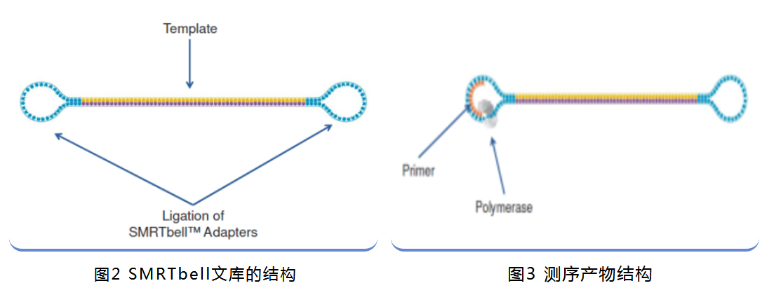 bell即“鈴”的意思,如圖2,構(gòu)建完成的bell文庫形狀就如同一個啞鈴。其主要組成部分是:發(fā)卡狀的接頭(Hairpin Adapter)和雙鏈DNA模板(Double Stranded DNA Template)。而文構(gòu)建完成后、測序前還需要完成bell文庫、Sequencing Primer、DNA Polymerase的混合工作(測序引物退火結(jié)合bell文庫,然后引物-bell文庫復(fù)合物結(jié)合DNA聚合酶)。最終產(chǎn)物如圖3所示。