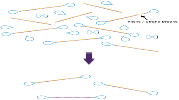 以基因組HiFi文庫為例(15-20K文庫)(圖4)。當(dāng)?shù)玫絞DNA后,先利用G-tube管或Megaruptor System將基因組片段化至合適大小,而后通過去除單鏈懸突、損傷修復(fù)和末端修復(fù)等步驟,得到完整的雙鏈插入片段。接下來,通過將接頭連接至雙鏈DNA來創(chuàng)建SMRTbell文庫,從而得到環(huán)狀模板。完成接頭連接后,需要對連接產(chǎn)物進行純化,利用酶處理(圖5)來消化線性或內(nèi)部損傷環(huán)形DNA分子(游離的Hairpin Adapter、兩端未連接Adapter的DNA模板、已成環(huán)但內(nèi)部有損傷的DNA模板),酶處理完畢后,一般會利用Bulepippin或Sage ELF System切膠回收目標(biāo)大小范圍內(nèi)的文庫。