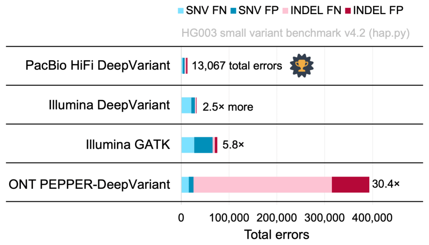 另外,由下圖可以看出(圖7),Google DeepVariant使用HiFi數(shù)據(jù)提交的結(jié)果在所有單一技術(shù)檢測全基因組范圍內(nèi)的變異z確性*高,對SNV√確度和召回率可以達(dá)到99.9%,對插入缺失的√確度和召回率可以達(dá)到99.4%[2]。