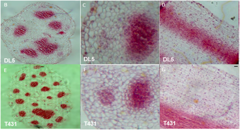 本研究利用石蠟切片法對(duì)其結(jié)構(gòu)變化及不育原因進(jìn)行觀察,觀察不育材料T431(圖1E)與對(duì)照材料(圖1B)成熟花柱的橫切,可以看出不育材料T431花柱中的維管束數(shù)目多于對(duì)照材料。同時(shí)形態(tài)觀察時(shí)發(fā)現(xiàn)不育材料花柱直徑顯著大于對(duì)照材料,維管束數(shù)目的增多可能直接導(dǎo)致了不育材料花柱直徑變大(圖1C, D, F, G)。觀察成熟花柱的細(xì)胞發(fā)現(xiàn)不育材料與對(duì)照材料花柱細(xì)胞大小沒有顯著差別。因此說明不育材料花柱伸長是由花柱細(xì)胞數(shù)目增多導(dǎo)致而非細(xì)胞體積變大導(dǎo)致。