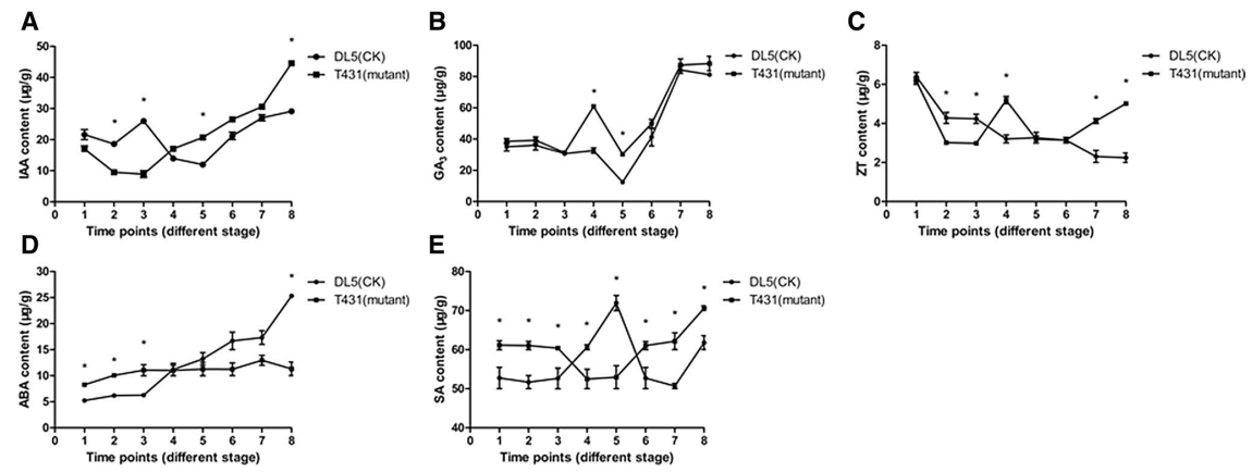 圖2 T431(不育材料)和DL5(對(duì)照材料)中不同激素在不同時(shí)期的變化趨勢(shì)